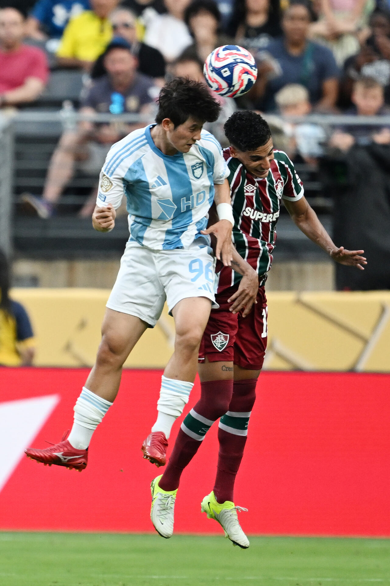 6月21日,蔚山HD队球员崔锡铉(左)与弗鲁米嫩塞队球员富恩特斯在比赛中争顶。新华社记者 李睿 摄