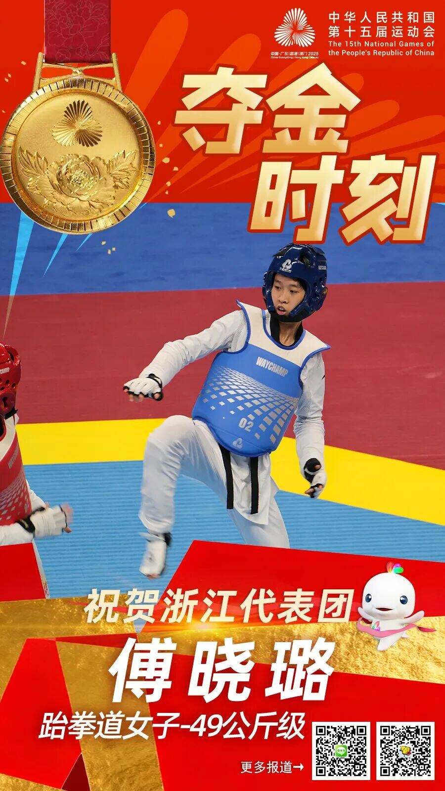 9月26日晚,第十五届全运会跆拳道女子-49公斤级决赛在广东惠州体育馆进行,2006年出生的浙江小将傅晓璐一路过关斩将,夺得冠军!这也是本届全运会浙江竞技项目的首枚金牌!