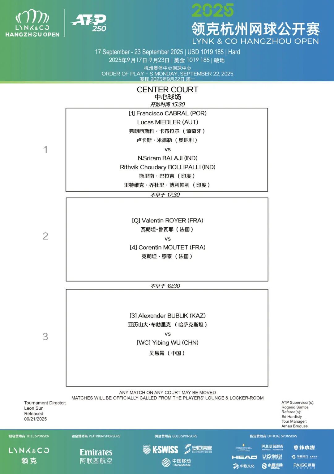 9月22日,2025领克杭州网球公开赛将迎来倒数第二个比赛日,中央球场将进行两场单打半决赛和一场双打半决赛。男单半决赛,吴易昺和亚历山大·布勃里克;克朗坦·穆泰和瓦朗坦·鲁瓦耶将捉对厮杀,冲击决赛名额。