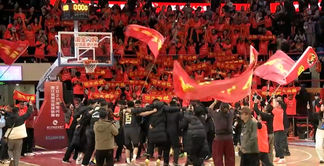 赛后丽水队围成一圈庆祝 球迷们激动地打出“丽水必胜”的横幅