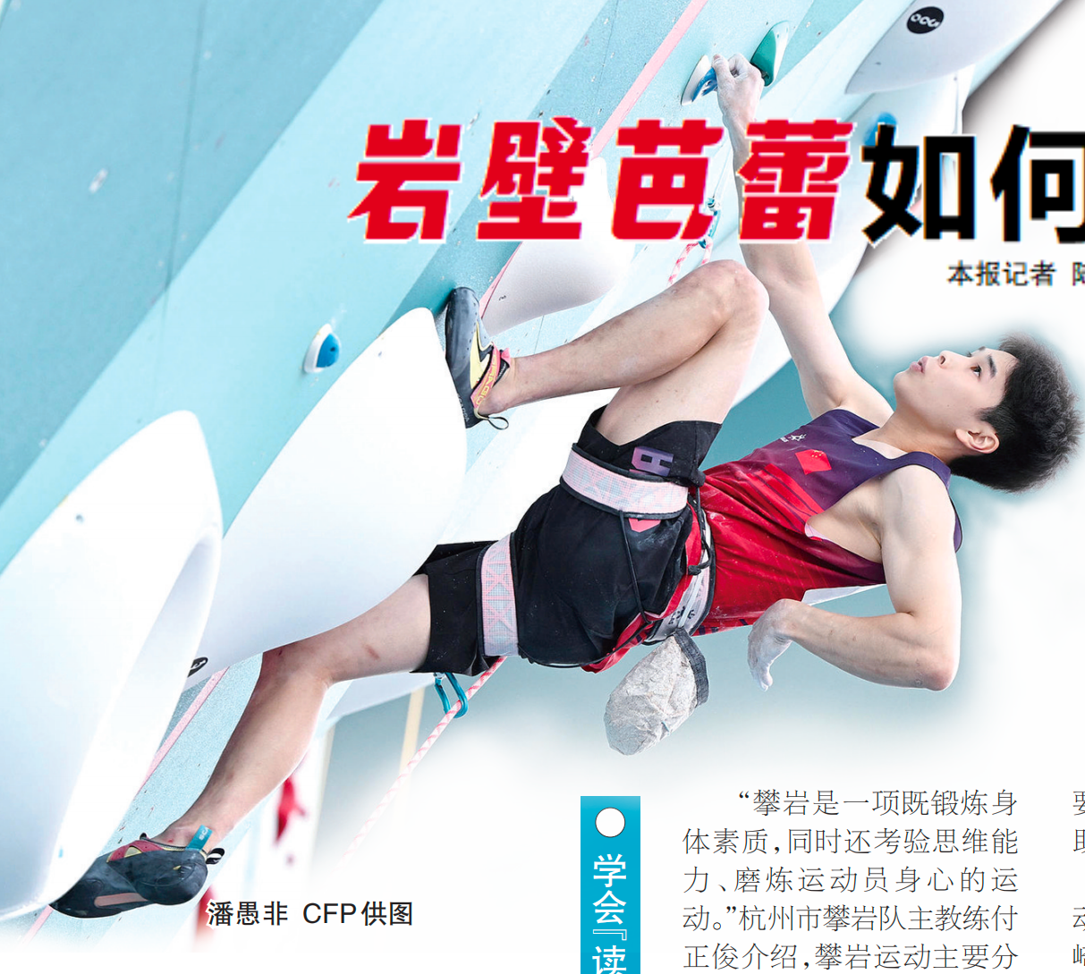 “攀岩是一项既锻炼身体素质,同时还考验思维能力、磨炼运动员身心的运动。”杭州市攀岩队主教练付正俊介绍,攀岩运动主要分为三个小项:攀石、难度和速度。对于初学者来说,简单的难度和攀石线路攀爬通常是最适合新人练习的,它是一个力量、技巧与意志力挑战兼具的项目。
