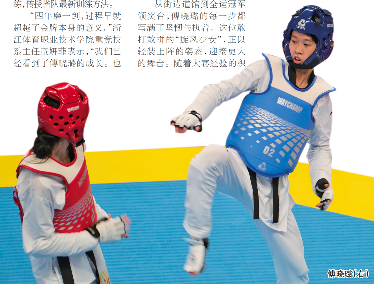 从街边道馆到全运冠军领奖台,傅晓璐的每一步都写满了坚韧与执着。这位敢打敢拼的“旋风少女”,正以轻装上阵的姿态,迎接更大的舞台。随着大赛经验的积累和技术的不断精进,傅晓璐还将继续书写属于自己的“旋风人生”,谱写中国跆拳道的新篇章。
