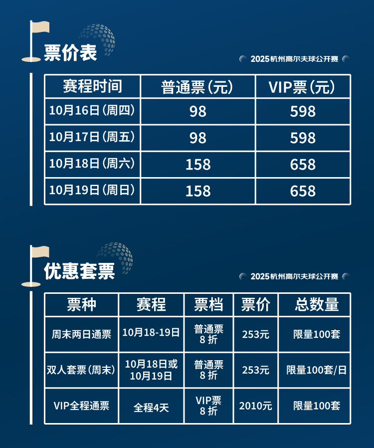 注:其中购买VIP票的观众享有进入位于18号洞果岭的VIP贵宾阁权益(贵宾阁提供茶歇和午餐)。