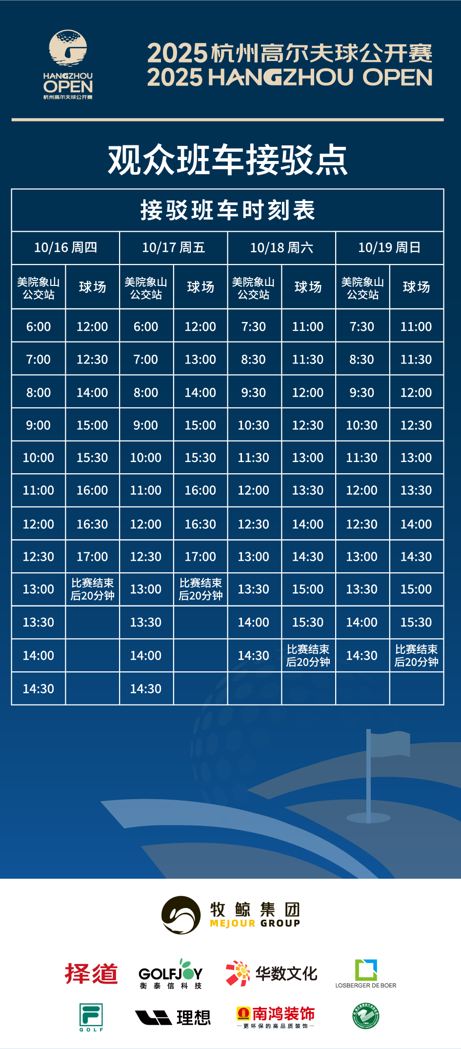 组委会为各位观众准备了接驳班车。各位观众可以在抵达美院象山地铁站B口后乘坐接驳车到达高尔夫比赛场地。班车接驳时刻表如下: