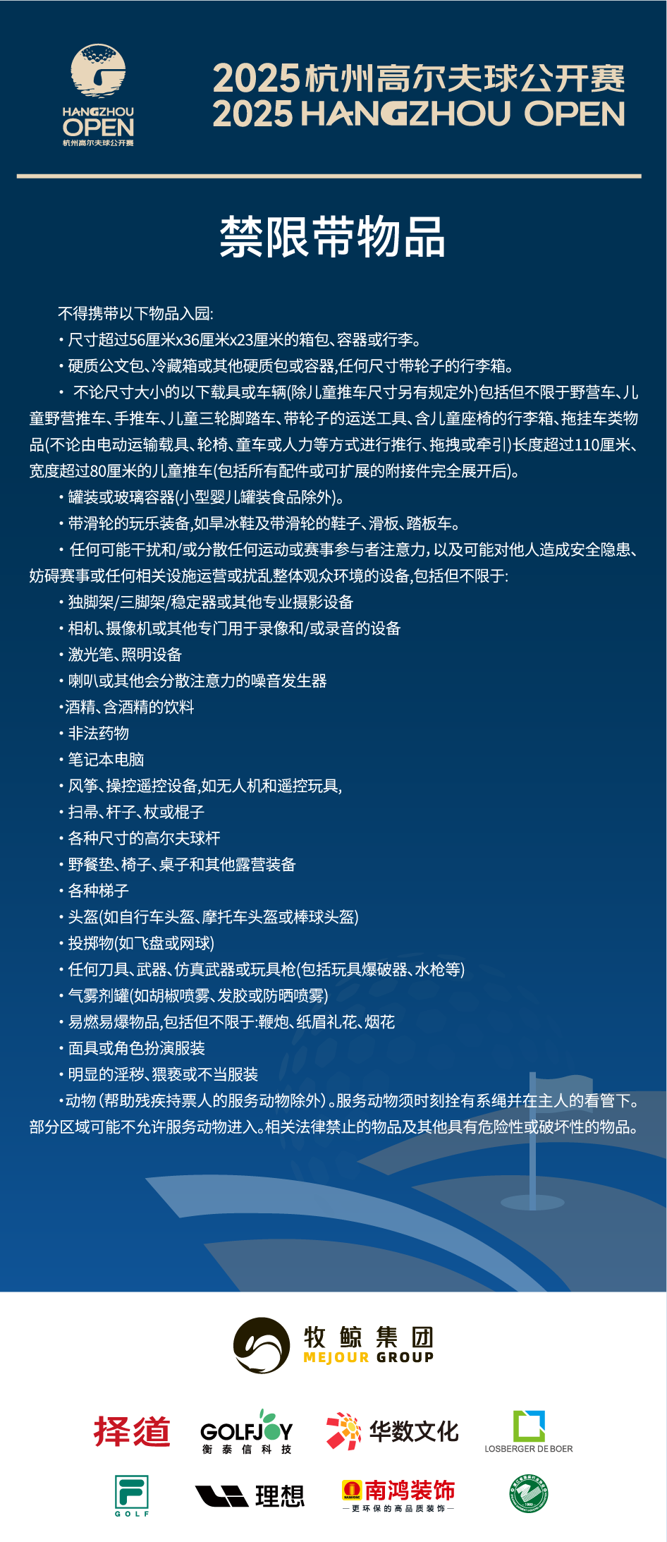 请各位观众注意,以下物品是禁止或者限制入场地的:(具体请遵循现场安保政策及要求。)