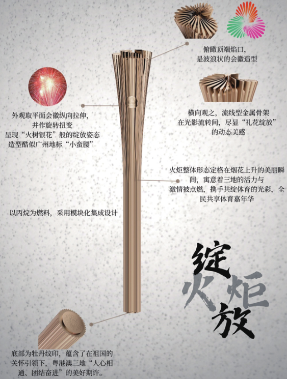 ●十五运会和残特奥会火炬名为“绽放”:以丙烷为燃料,高760毫米,焰口部位最大尺寸125毫米、把手部位最小直径52毫米,净重1.6公斤。“绽放”外观呈“火树银花”绽放状,酷似广州地标“小蛮腰”。俯瞰顶端焰口为“波浪”状会徽造型,横看火炬以流线型金属为骨,在光影流转中呈现“礼花绽放”的动态美感,底部为牡丹纹印。