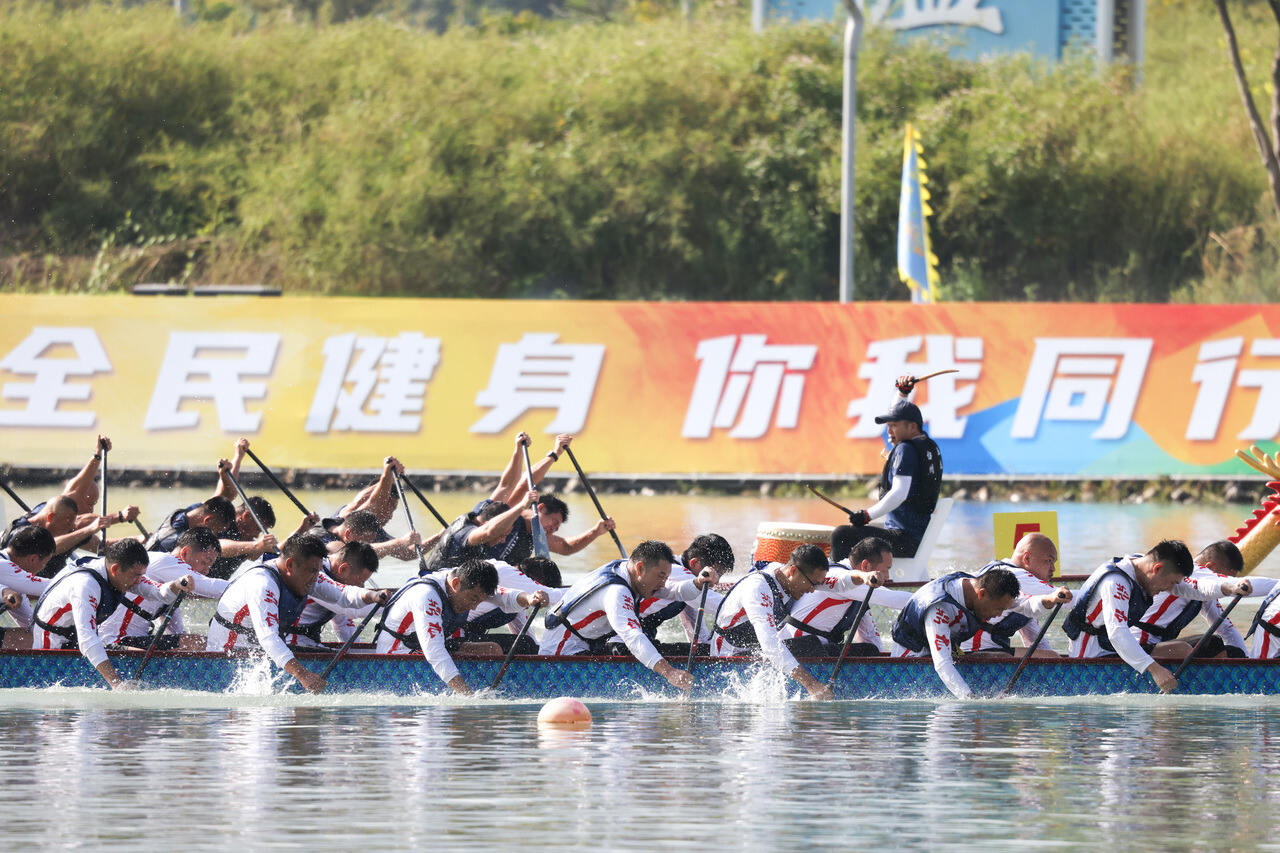 在庄重的传统龙舟“点睛”仪式后,比赛正式敲鼓鸣锣宣布开赛。刹那间,一艘艘龙舟如蛟龙出水,鼓手抡锤力贯千钧,富有节奏的鼓点成为所有桨手统一的行动号令。桨手们应声下腰、划水,动作整齐划一,充满力量。
