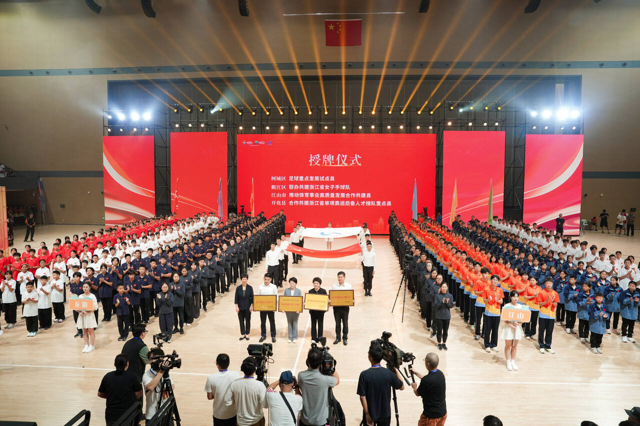 浙江省体育职业技术学院党委书记郭海英为柯城区颁发足球重点发展试点县、为衢江区颁发联办共建浙江省女子手球队、为江山市颁发推动体育事业高质量发展合作共建县、为开化县颁发合作共建“浙江省单项奥运后备人才梯队”重点县牌匾。国家体育总局手曲棒垒中心主任、中国手球协会主席王涛为衢江区人民政府授国家少年女子手球队旗并致辞。
