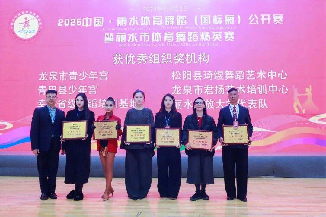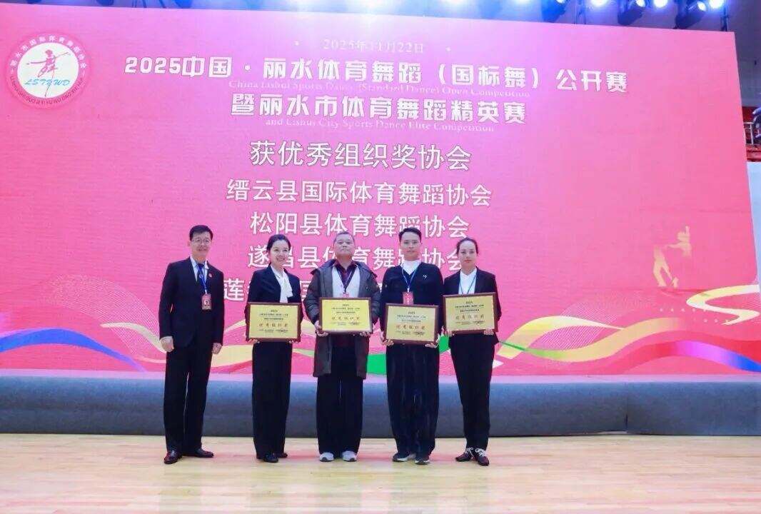 此外,为表彰各单位对本次赛事的大力支持与积极组织,组委会特别评选出优秀组织奖。其中,缙云县国际体育舞蹈协会、松阳县体育舞蹈协会、遂昌县体育舞蹈协会、莲都区国际体育舞蹈协会获“优秀组织奖协会”;龙泉市青少年宫、青田县青少年宫、龙泉市君扬艺术培训中心、松阳县琦煜舞蹈艺术中心、幸民省级舞蹈培训基地、丽水开放大学6家单位获“优秀组织奖机构”。