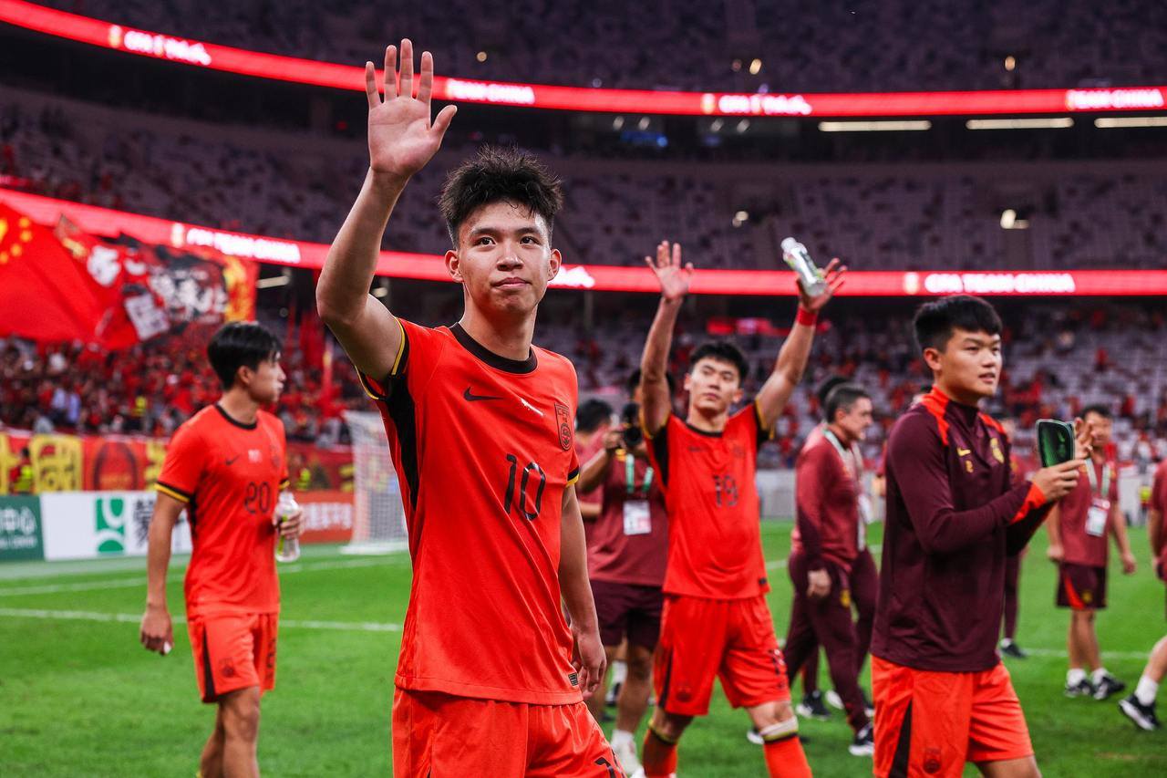 U23亚洲杯预选赛第3轮,澳大利亚0-0中国携手出线,王钰栋在赛后向观众致意。图片来源:视觉中国