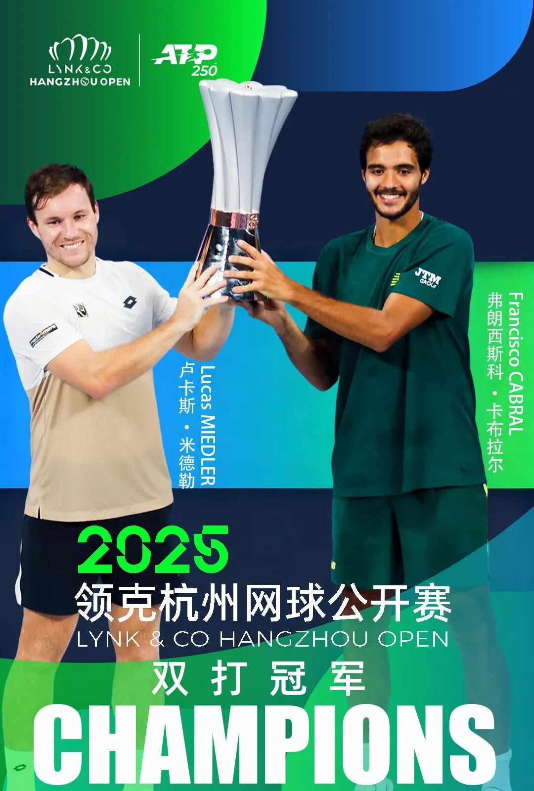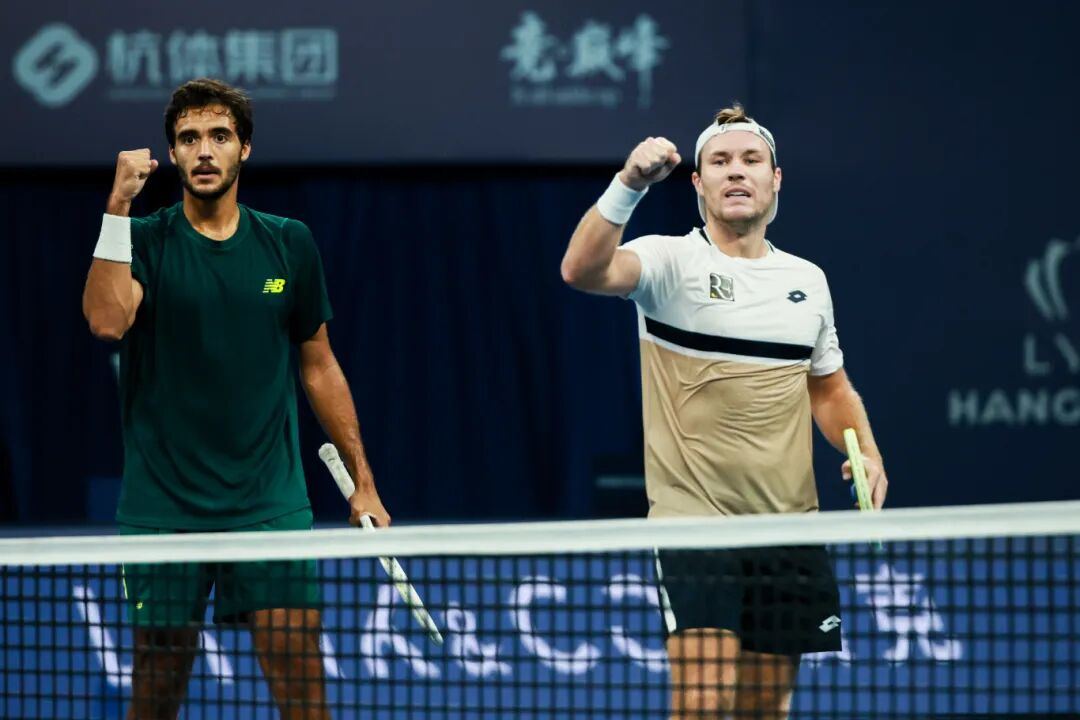 在下午率先结束的男双决赛中,赛会1号种子弗朗西斯科·卡布拉尔(葡萄牙)/卢卡斯·米德勒(奥地利)2比0(6-4/6-4)战胜尼古拉斯·巴里恩托斯(哥伦比亚)/大卫·佩尔(荷兰)夺得2025领克杭州网球公开赛男双冠军。