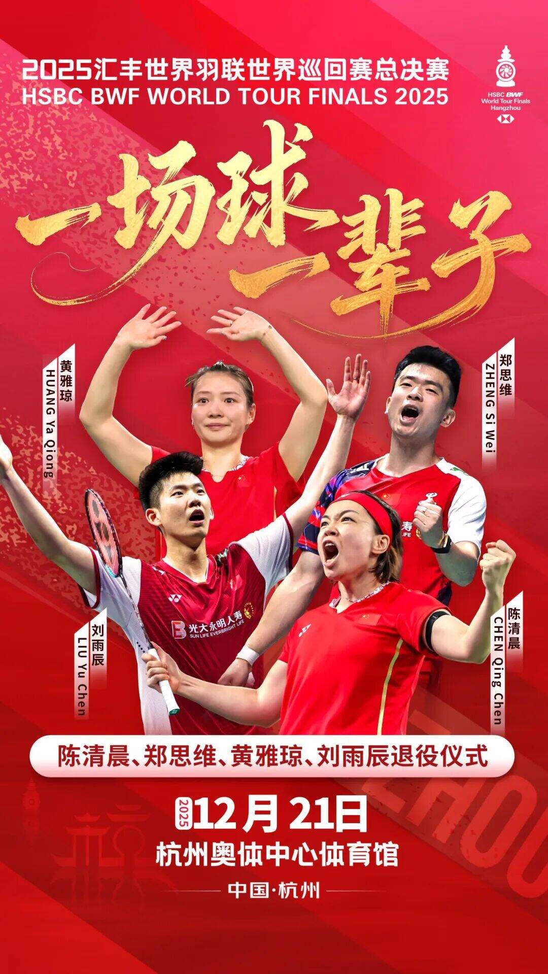 12月21日晚,世界羽联世界巡回赛总决赛当日赛事收官后,陈清晨、郑思维、黄雅琼、刘雨辰将举办他们的退役仪式。