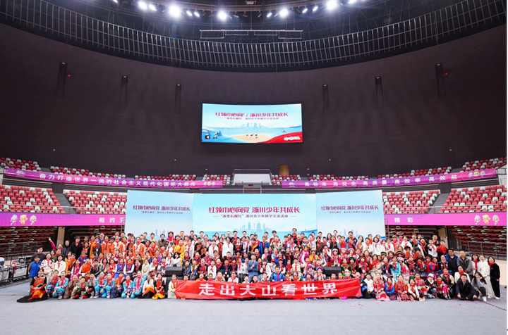 四川的青少年展示了具有民族特色的歌舞《村居》、《羊角花儿云里开》,将家乡美景搬上舞台,将满心的欢喜与感激载歌载舞表达出来。