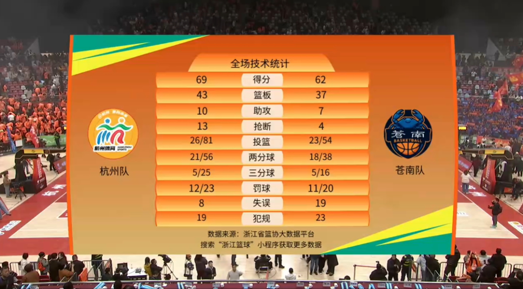 终场哨响,比分定格在69∶62,杭州队以7分优势赢得淘汰赛首轮比赛。