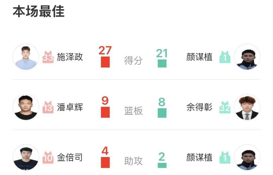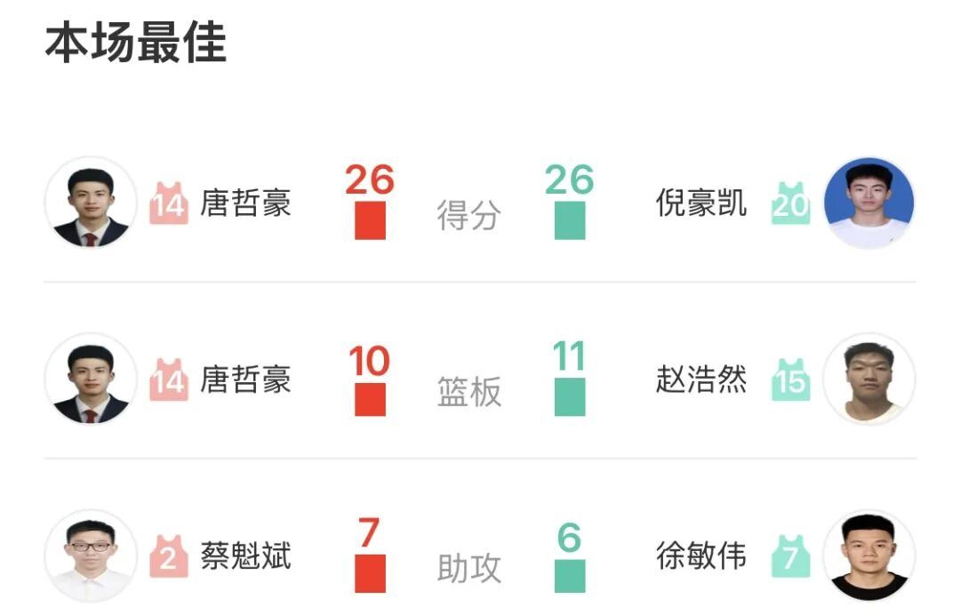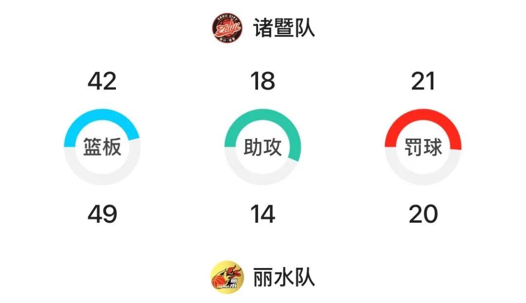 本场比赛,诸暨队3人得分上双:唐哲豪26分、潘幸辰14分、蔡魁斌10分;丽水队4人得分上双:倪豪凯26分、徐敏伟18分、丁邹凯17分,赵浩然11分。