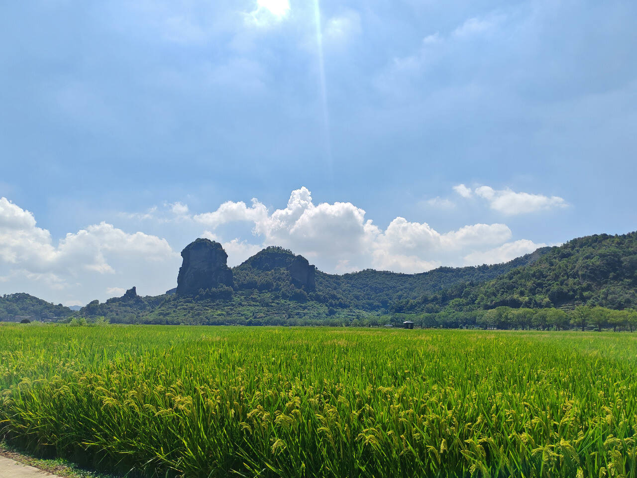 沿着田间步道漫步,鼻尖萦绕着稻谷的清香,远处石柱峰高高矗立,近处稻浪翻滚,沙沙作响,随手一拍都是大片。走累了,稻田里还藏着一家“稻田咖啡”,提供各种饮料和小甜品。坐下来,一边喝咖啡一边欣赏美景,是多么惬意。