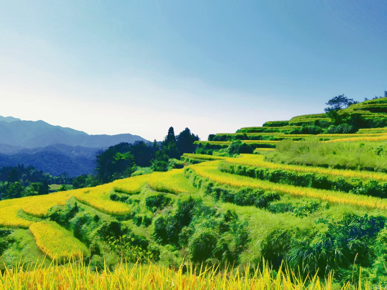 进入十月,稻子由青转黄,北山梯田迎来了一年中最美的时候。层层叠叠的金黄从山脚一直延伸到山顶,错落有致,在阳光的照耀下,流光溢彩,展现出蓬勃的生命力。微风轻拂,稻浪翻滚,整座山都成了一幅流动的画卷。