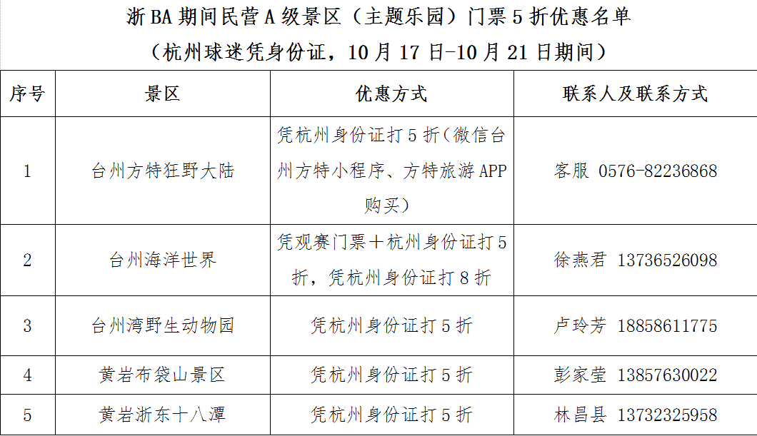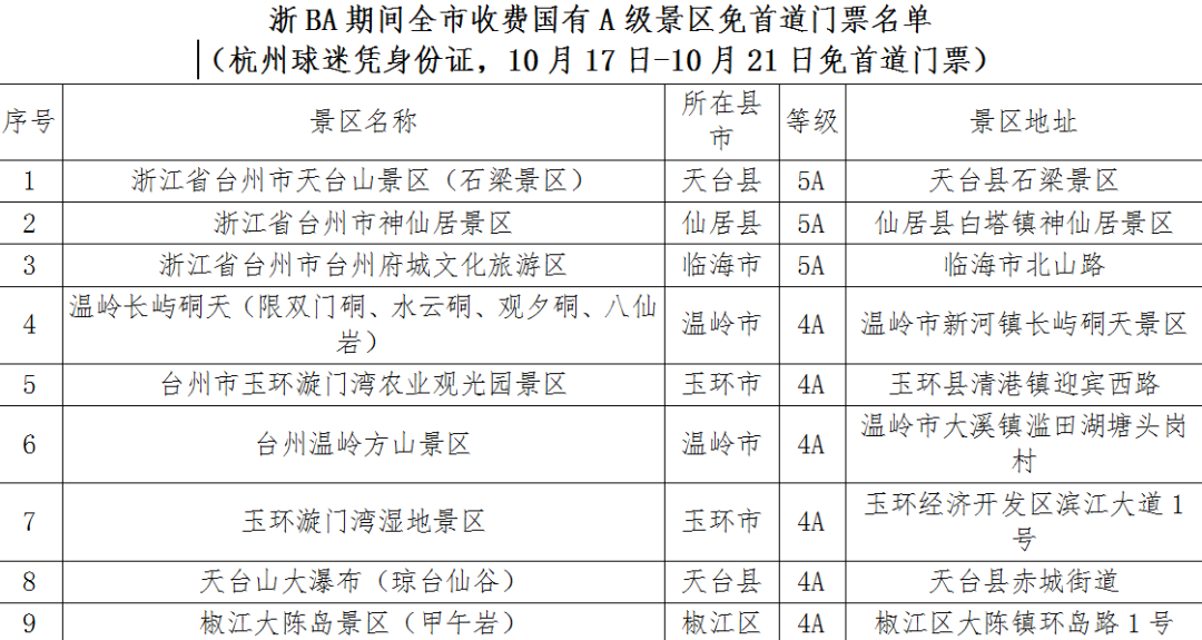 10月17日至10月21日共5天,杭州市民凭身份证可在台州以下场所享受福利: