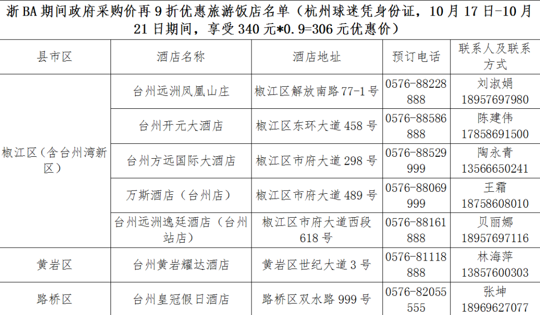 在推荐的台州旅游饭店享受政府协议价基础上再打九折的优惠政策,单间房价在300元左右,以市区为主,其他县(市)各有1家参与,为杭州游客游览台州提供便利。