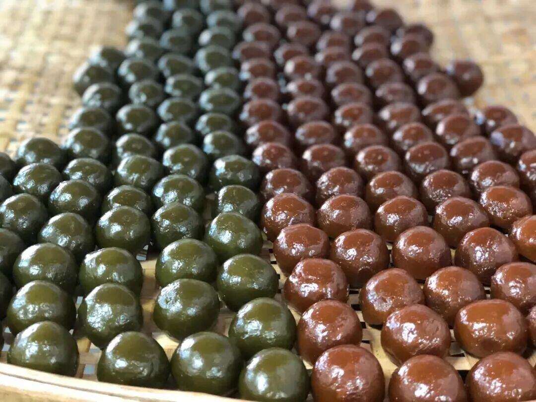 刚盛出的浓稠米糊火热烫手,趁热乎软糯,揪一把搓成乒乓球大小的团子,整齐放入蒸笼后隔水蒸煮。经过水蒸气的洗礼,小团子转为褐色。这样经过两次加热,灰汁团才算圆满出炉 。