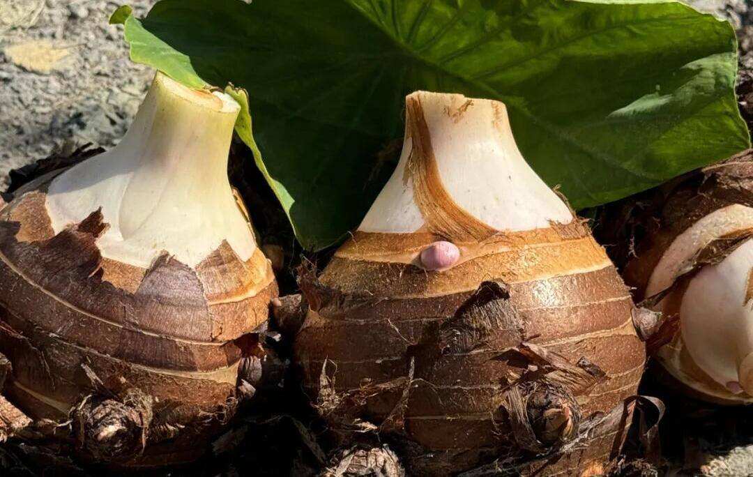 奉化芋艿头分水旱两类,如今最负盛名的,是“奉化红芋艿”。这种芋艿主要食用的是它的母芋(即大芋头中心连接苗株的核心部分,与周围的子芋区分开来)。母芋一般单个重2斤以上,个头大的可以达到5斤左右,跟小西瓜都有一拼了。