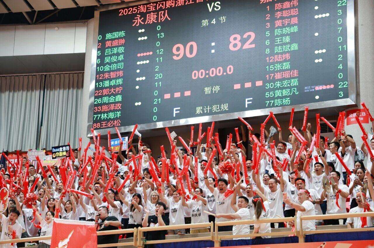 决战时刻来临,全场氛围瞬间攀至顶点,双方毫无保留地展开终极较量,每一次进攻和防守都充满了火药味,赛况十分胶着。面对嘉兴队来势汹汹的进攻势头,永康队展现出了强大的心理素质和团队凝聚力,始终保持领先。在双方陷入拉锯战时,施泽政化身“关键先生”一记三分命中,并随后罚进两球,再度拉开比分。终场哨响,比分定格在90:82,永康队在球迷的欢呼下拿下比赛,斩获第六胜。
