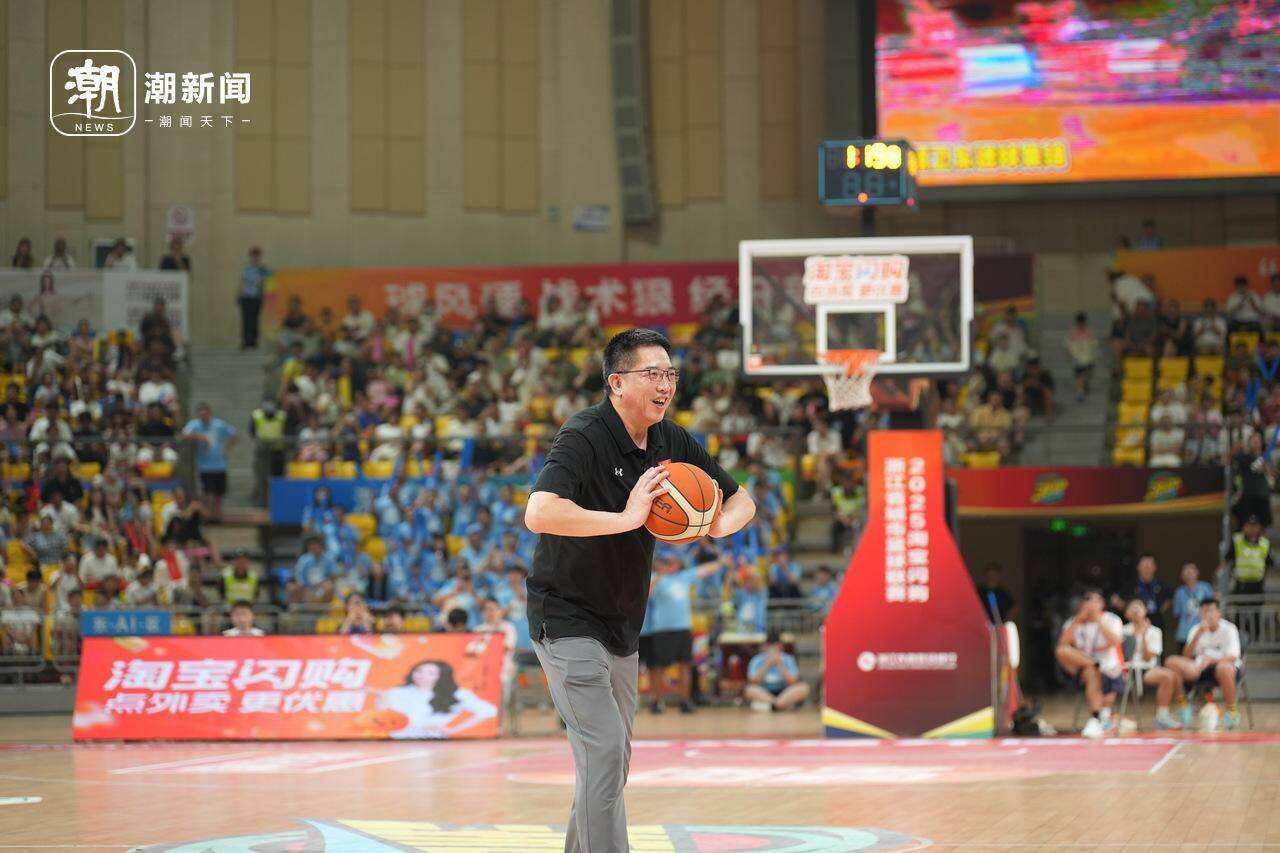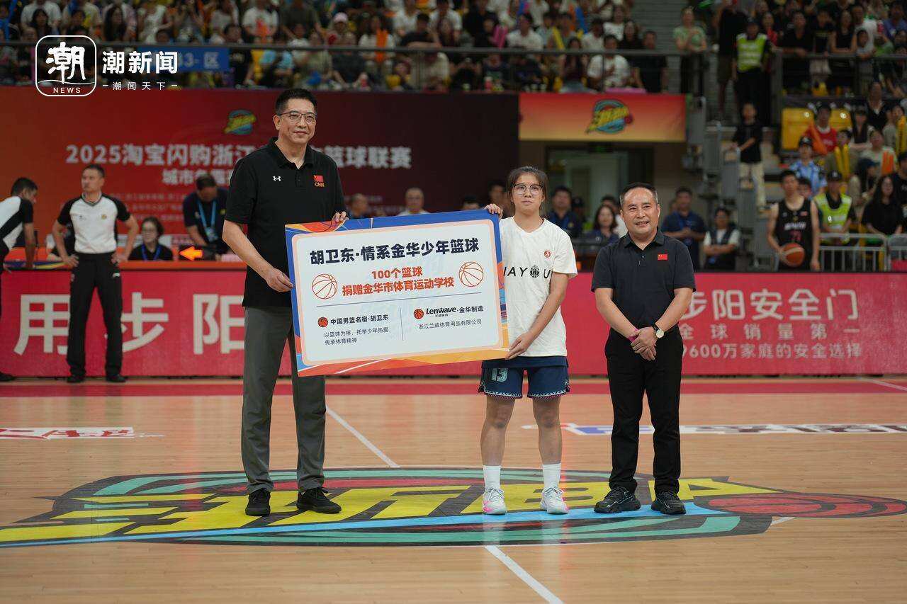 中场休息,胡卫东登场与两队球员互动。他化身传球手,分别助攻金华队33号陈凯歌、嘉兴经开区队77号曹裕霄扣篮,引发全场欢呼。胡卫东还向金华市体育运动学校捐赠了100个篮球,支持金华少年篮球运动发展。