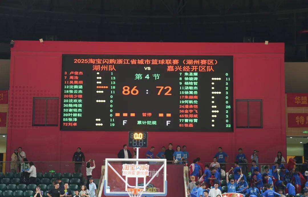 经过四节酣战,湖州队主场击败嘉兴经开区队,将比分定格在86:72。