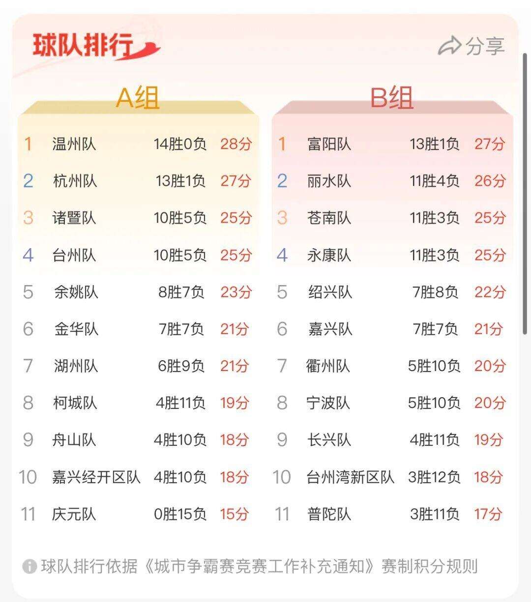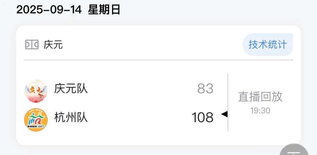 本场比赛后,杭州队的战绩为13胜1负积27分,庆元队的战绩为0胜15负积15分。