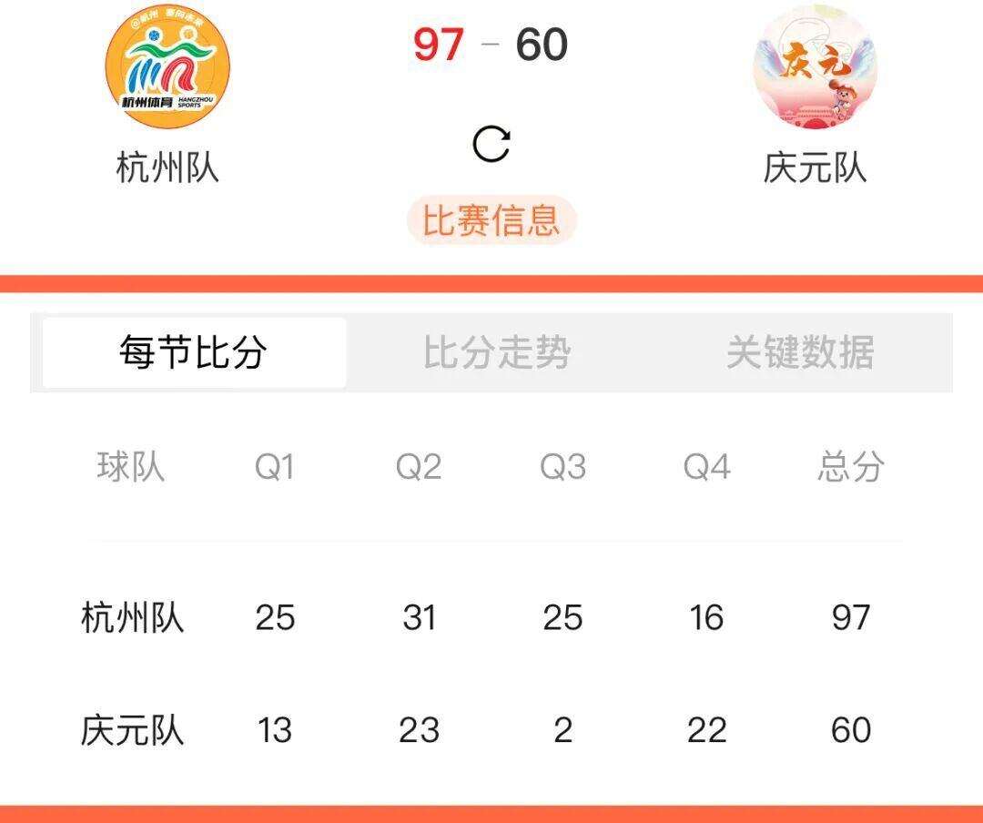 97:60,杭州37分大胜庆元,本场过后,杭州取得13胜1负,同时保持了主场7连胜的战绩。