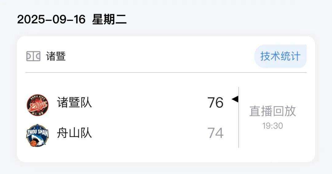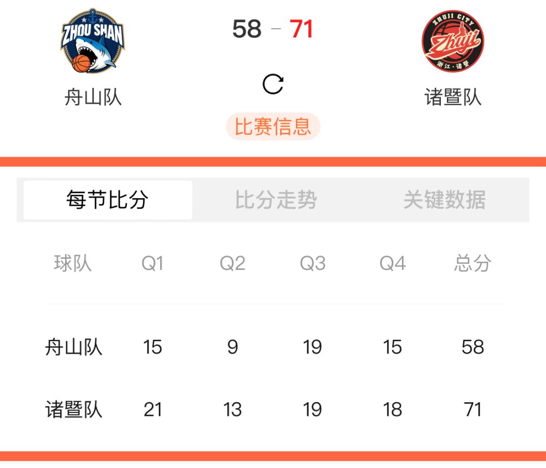本场比赛后,舟山队的战绩为4胜11负积19分,诸暨队的战绩为11胜5负积27分。