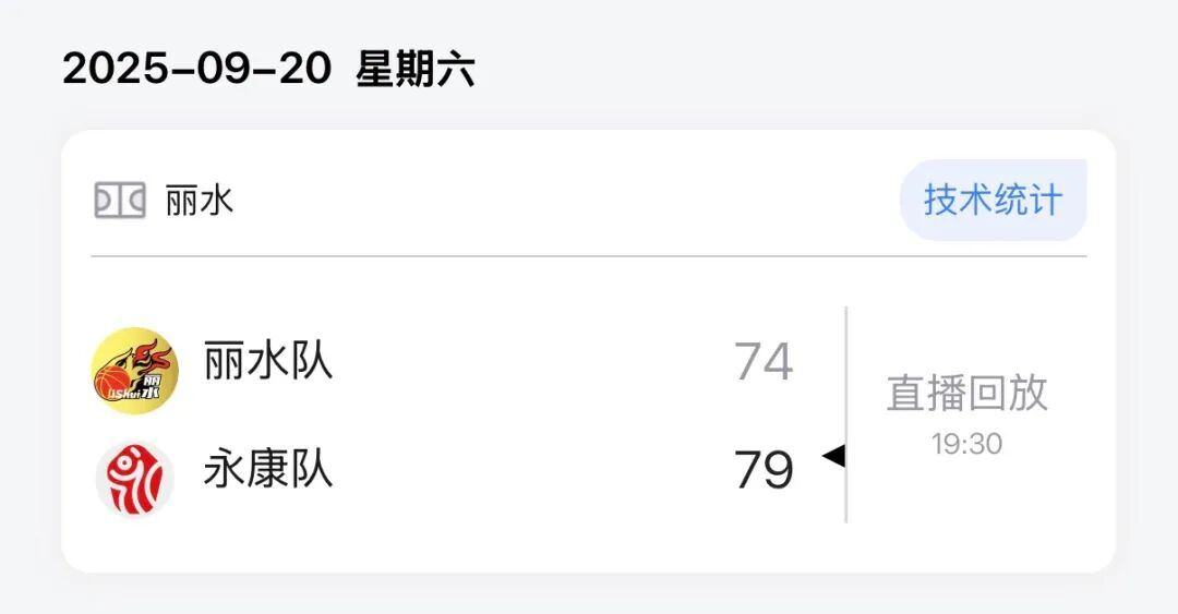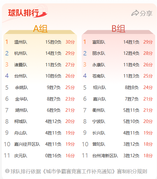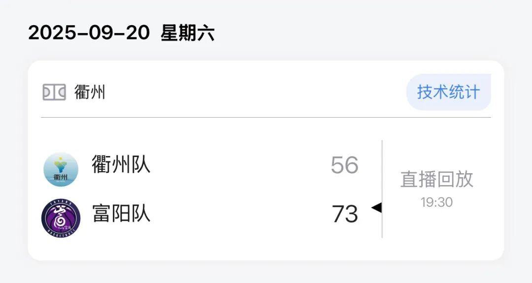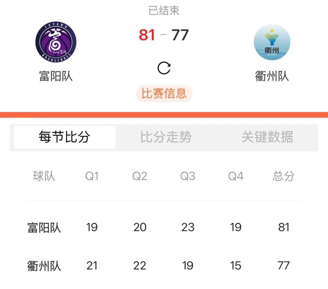 本场比赛后,富阳队的战绩为14胜1负积29分,衢州队的战绩为5胜11负积21分。