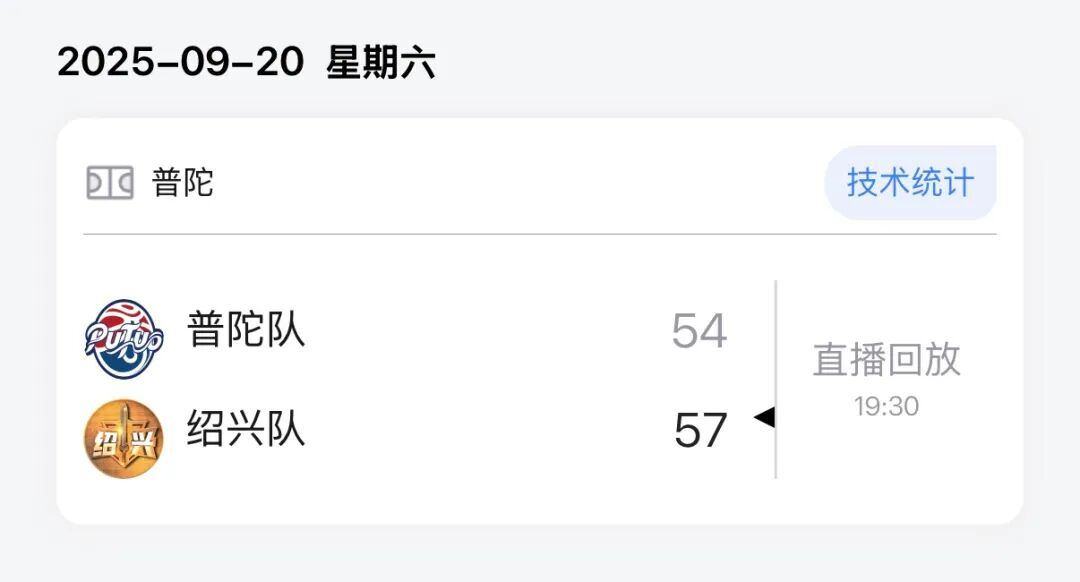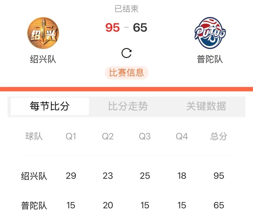 本场比赛后,绍兴队的战绩为8胜8负积24分,普陀队的战绩为3胜12负积18分。