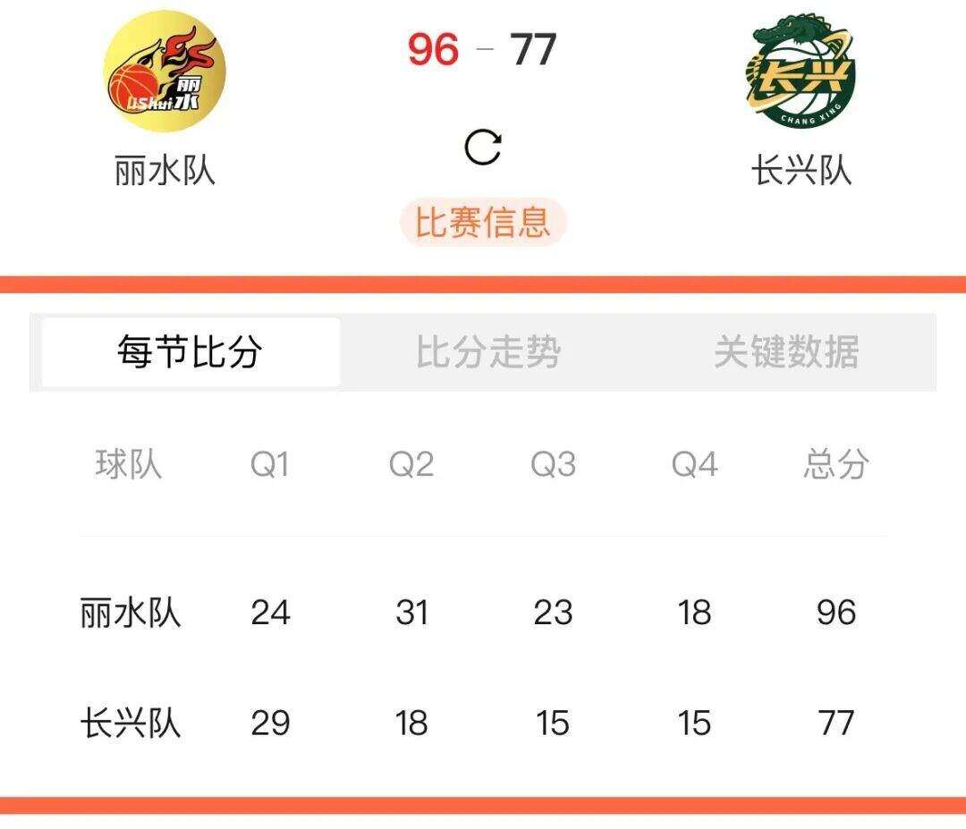 本场比赛后,丽水队的战绩为13胜4负积30分,长兴队的战绩为4胜12负积20分。