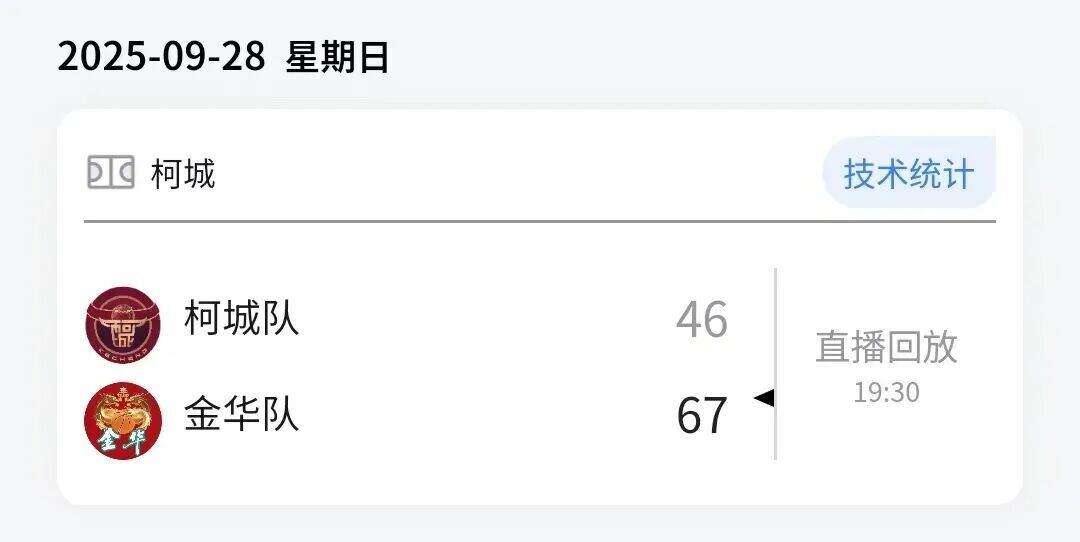 本场比赛后,金华队的战绩为9胜7负积25分,柯城队的战绩为4胜13负积21分。
