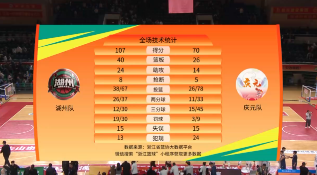 湖州107:70庆元 湖州胜!