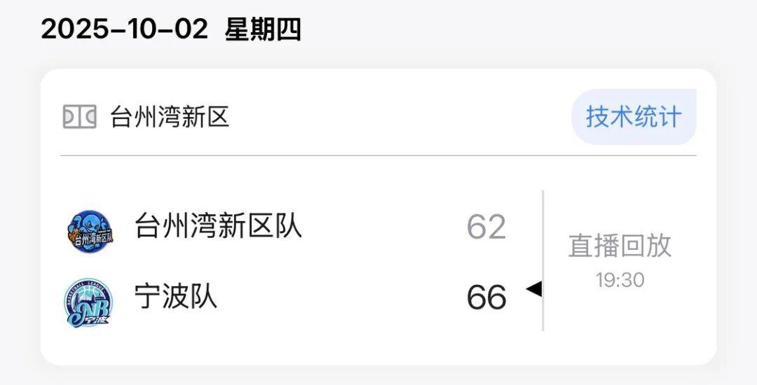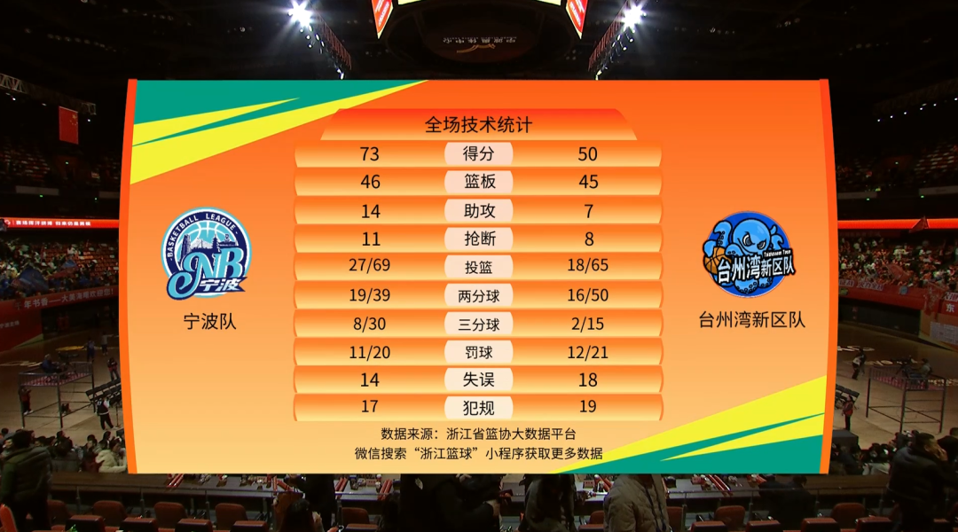 本场比赛后,宁波队的战绩为7胜11负积25分,台州湾新区队的战绩为3胜14负积20分。