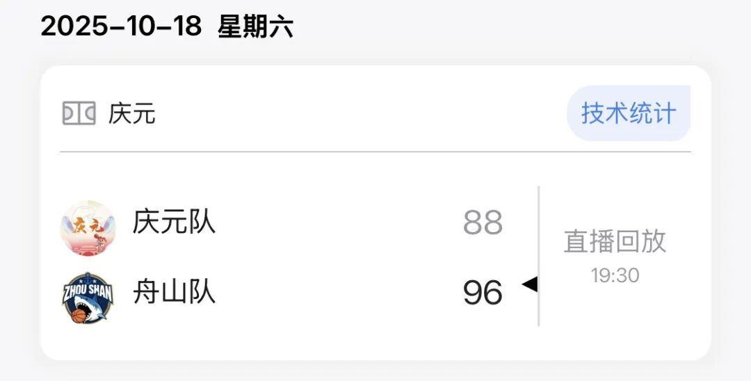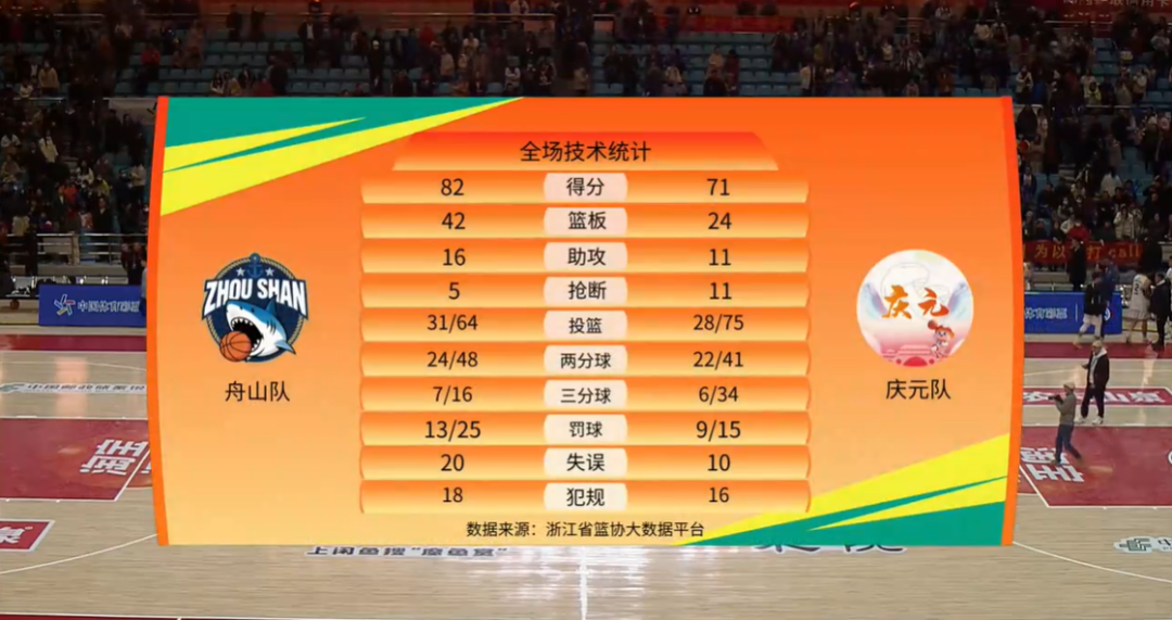 本场比赛后,舟山队的战绩为5胜14负积24分,庆元队的战绩为0胜19负积19分。