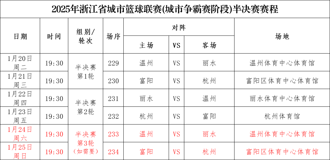 1月17日,浙BA赛事组组委会发布了半决赛赛程。