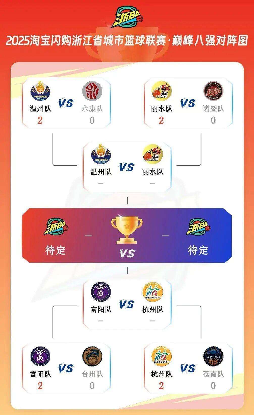 浙BA八强赛采用三局两胜制。今晚,杭州队率先以大比分2∶0战胜苍南队,顺利晋级四强。台州队和富阳队再次拼至最后一秒,最终,富阳队以大比分2∶0战胜台州队,成为浙BA四强唯一的县队。这也意味着,杭州队、富阳队将在半决赛相遇,展开对决!