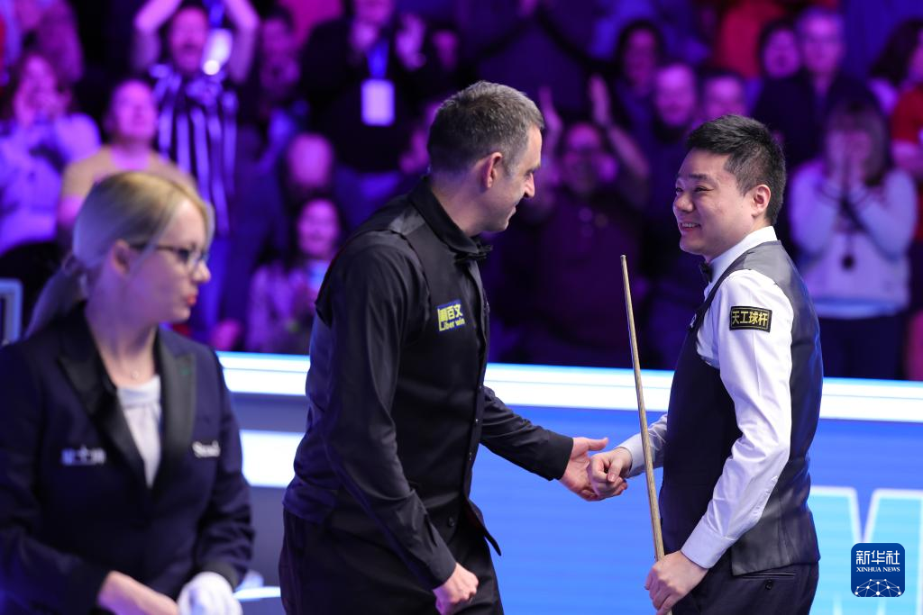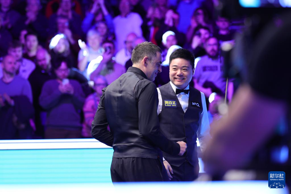 1月8日,丁俊晖(右)与奥沙利文在比赛后相互致意。新华社发(翟政摄)