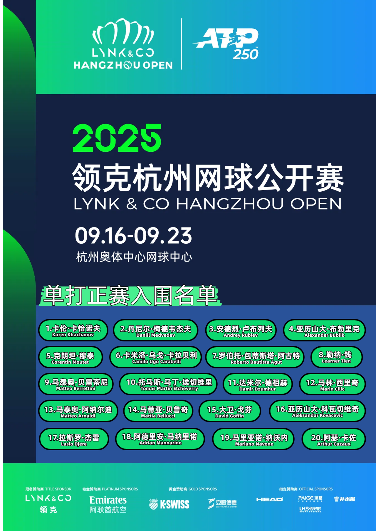 卡恰诺夫、卢布列夫、梅德韦杰夫领衔!2025领克杭州网球公开赛参赛名单正式发布