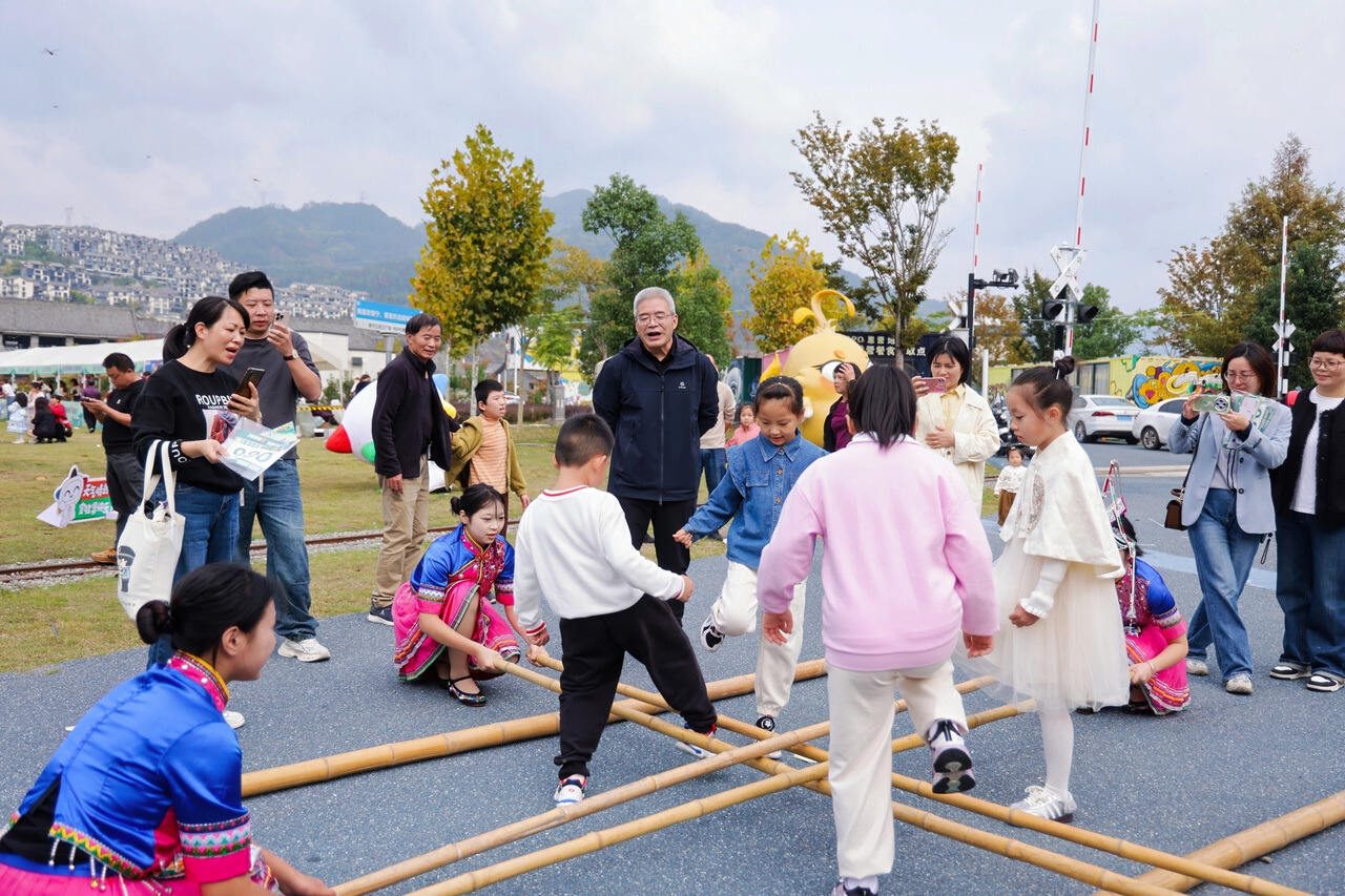 “这些活动、这些美食,都是从畲族生活里来的。”现场负责人介绍,竹竿舞是节庆时的热闹玩法,龙接凤藏着对美好生活的期盼,乌饭、豆腐娘更是刻在畲族人骨子里的味觉记忆,“如今把运动和美食结合,不仅让更多人了解畲族文化,更让古老传统有了新的生命力。”活动中,不少家长带着孩子跟着畲族乡亲学跳竹竿舞、学磨乌饭叶,银饰碰撞声、竹竿敲击声、美食香气与欢笑声在山谷间久久回荡,成了最动人的乡村交响。