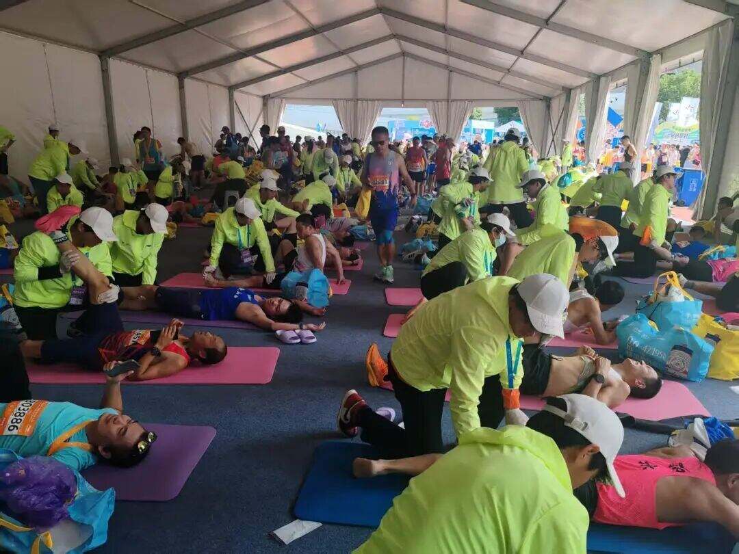 彩虹鱼康复运动康复中心组长郭沪敏介绍,本次共派出11名专业康复人员驻守全马、半马拉伸区,同时还有近300名来自浙江体育职业技术学院的志愿者参与服务,“这些志愿者都来自运动保健与康复、体育运营与管理等相关专业,赛前还经过了系统的培训和实践,能为跑者提供专业保障。”