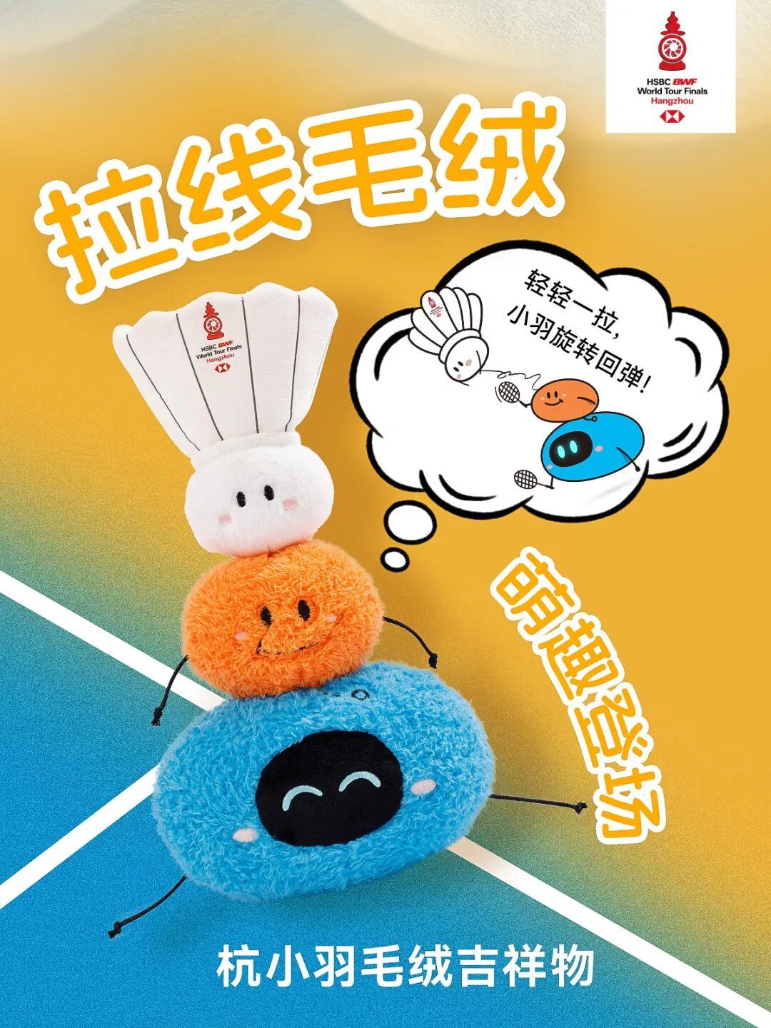 赛事官方吉祥物“杭小羽”可爱返场!以西湖 “三潭印月”为设计灵感,由代表梦想的羽毛球小精灵“小羽”、象征活力的橙色小精灵“小小”、寓意智能的蓝色小精灵“小杭”组成,整体造型与赛事会徽一脉相承,将羽毛球运动的活力与杭州城市韵味融为一体,成为传递赛事精神、弘扬城市文化的重要载体。