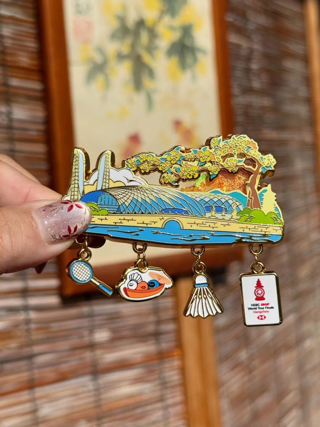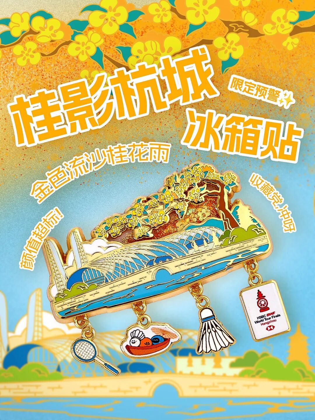 把西湖桂雨和杭州奥体中心体育馆“装”进冰箱贴,采用金色流沙工艺呈现桂花飘落细节,搭配球拍、羽毛球、赛事标志与“杭小羽”的流苏挂坠,细节感拉满。作为限量发售的城市限定款冰箱贴,兼具装饰与收藏价值。