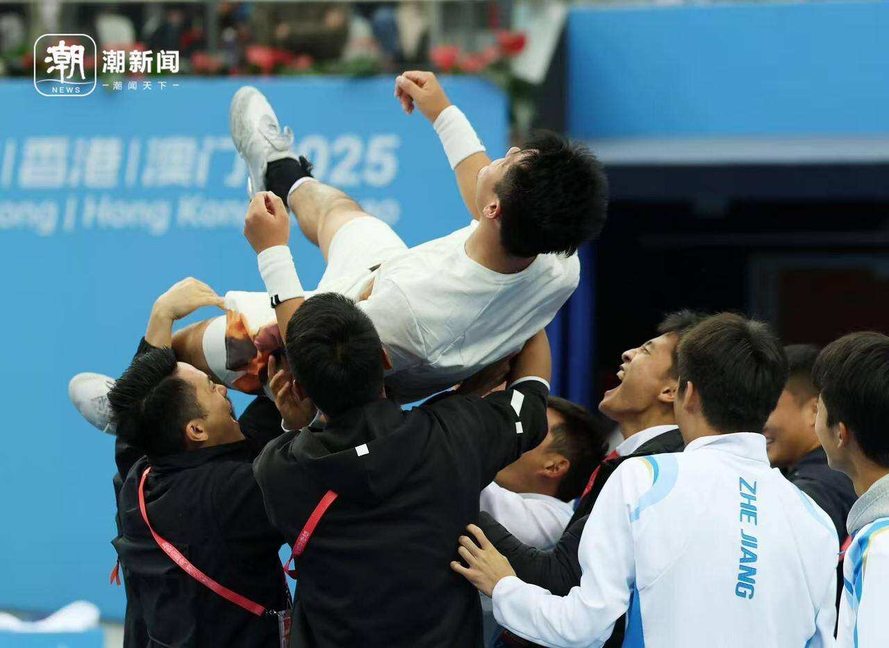 获得胜利后,吴易昺坐在场地上激动落泪,浙江队友们将他高高举过头顶,庆祝这份来之不易的胜利。