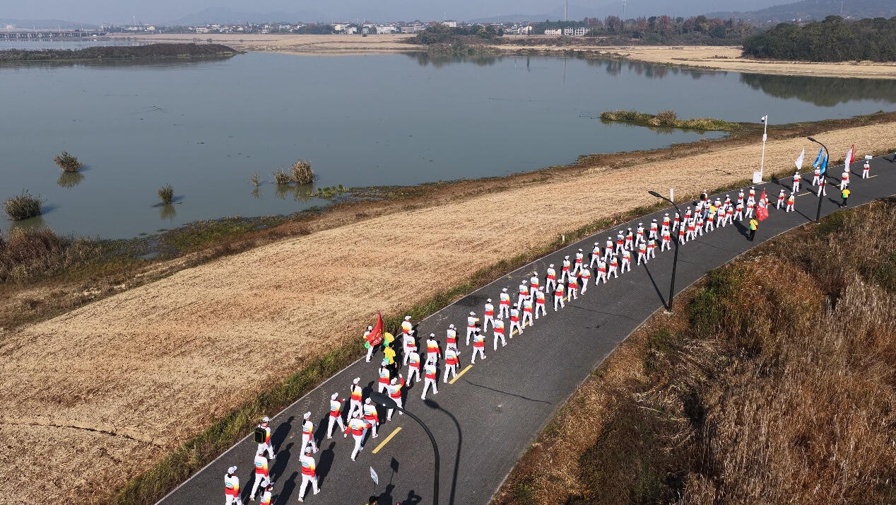 上午八时三十分,随着嘹亮的汽笛划破天际,徒步大会正式开启。身着统一活动服饰的徒友们精神抖擞、意气风发,沿着环湖路线稳步前行。初冬的暖阳洒在波光粼粼的湖面上,芦苇随风摇曳,水雉、天鹅、白鹭等珍稀鸟类不时掠过水面;沿途田垄间,此前收割完毕的高粱与水稻留下整齐的田埂痕迹,新播撒的油菜种子已在土壤中孕育生机,这份当下的开阔静谧,正是为了来年春天漫坡遍野的金色花海蓄力。水天一色的生态美景、暗藏生机的田野风光与徒步者的活力身影相映成趣,构成了一幅人与自然和谐共生的动人画面。大家或结伴而行、谈笑风生,或驻足拍照、定格美景,在沉浸式体验中感受诸暨的生态之美,践行着“不为竞赛争高下,只为赴一场山水之约”的活动初心。